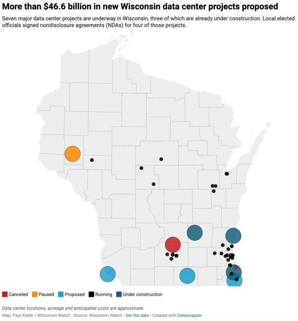 A Wisconsin Watchย investigationย found that local officials in some of the seven communities where hyperscale data centers have been proposed worked on the proposals for months before making any announcement to the public. In four of the communities, officials signed confidential nondisclosure agreements (NDAs), pledging to keep details of the plans private.