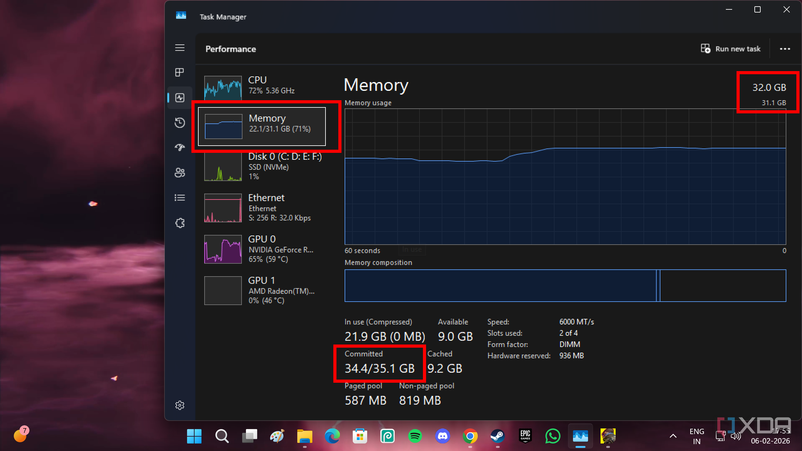 If you want to know whether or not you need more RAM, and it’s being used to its highest potential, keep a game running. Then, go ahead and open several browser tabs. Then, go ahead and open up Task Manager (Win+Shift+Esc), head into the Performance tab, and select Memory. Take a look at the Committed Memory information. If the Committed Memory exceeds your actual physical RAM capacity, that means the system is swapping to the SSD, which will cause stutters. It’s important to mention here that the test needs to be under your regular usage, and not under artificially-induced loads that you won’t ever recreate on a day-to-day basis.