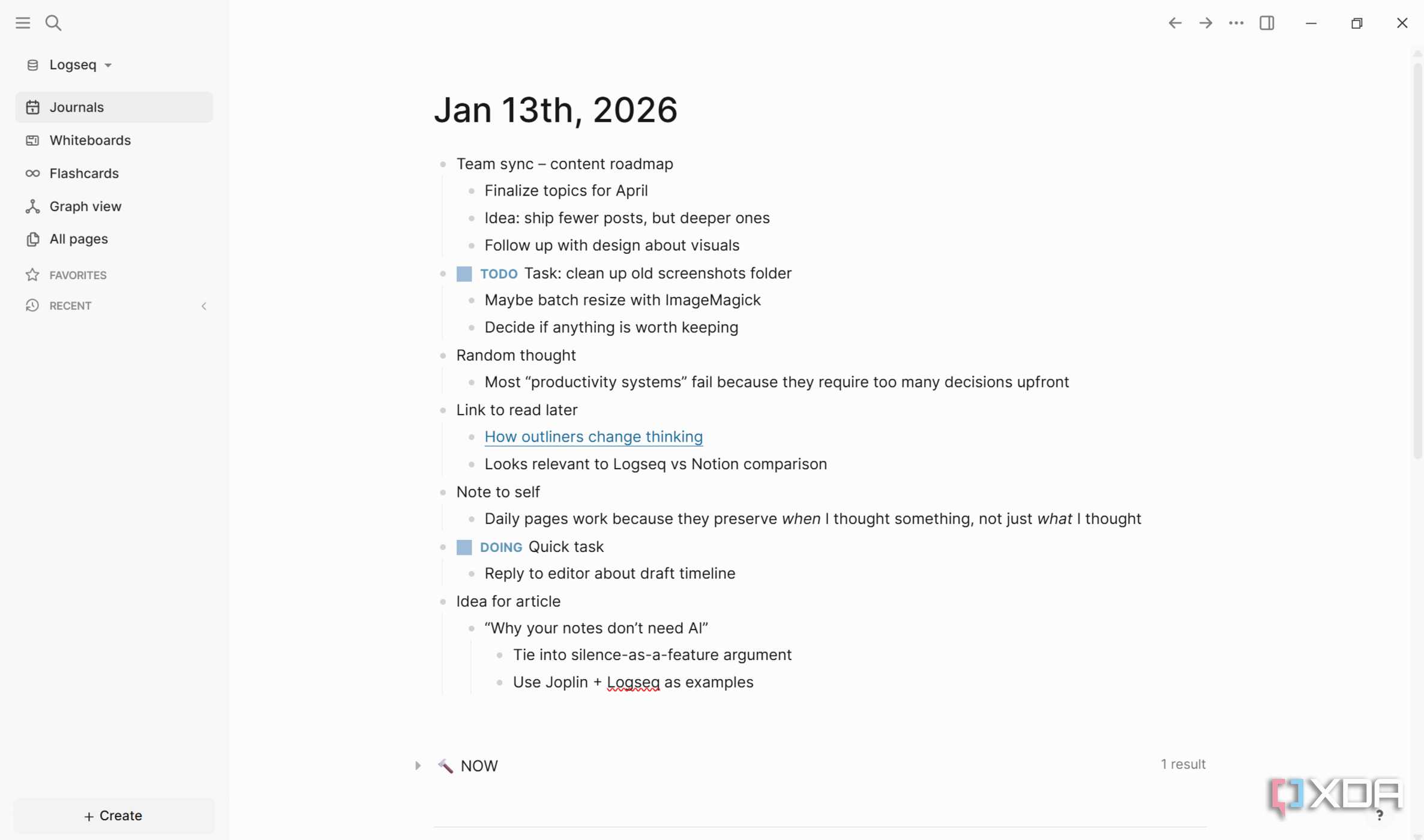 Logseq, on the other hand, is a free, open-source outliner that uses daily pages and bidirectional linking. But it only worked when I stopped trying to impose structure on it. The moment I abandoned folders, tags, and rigid organization was the moment Logseq quietly absorbed all three apps into one frictionless workflow.