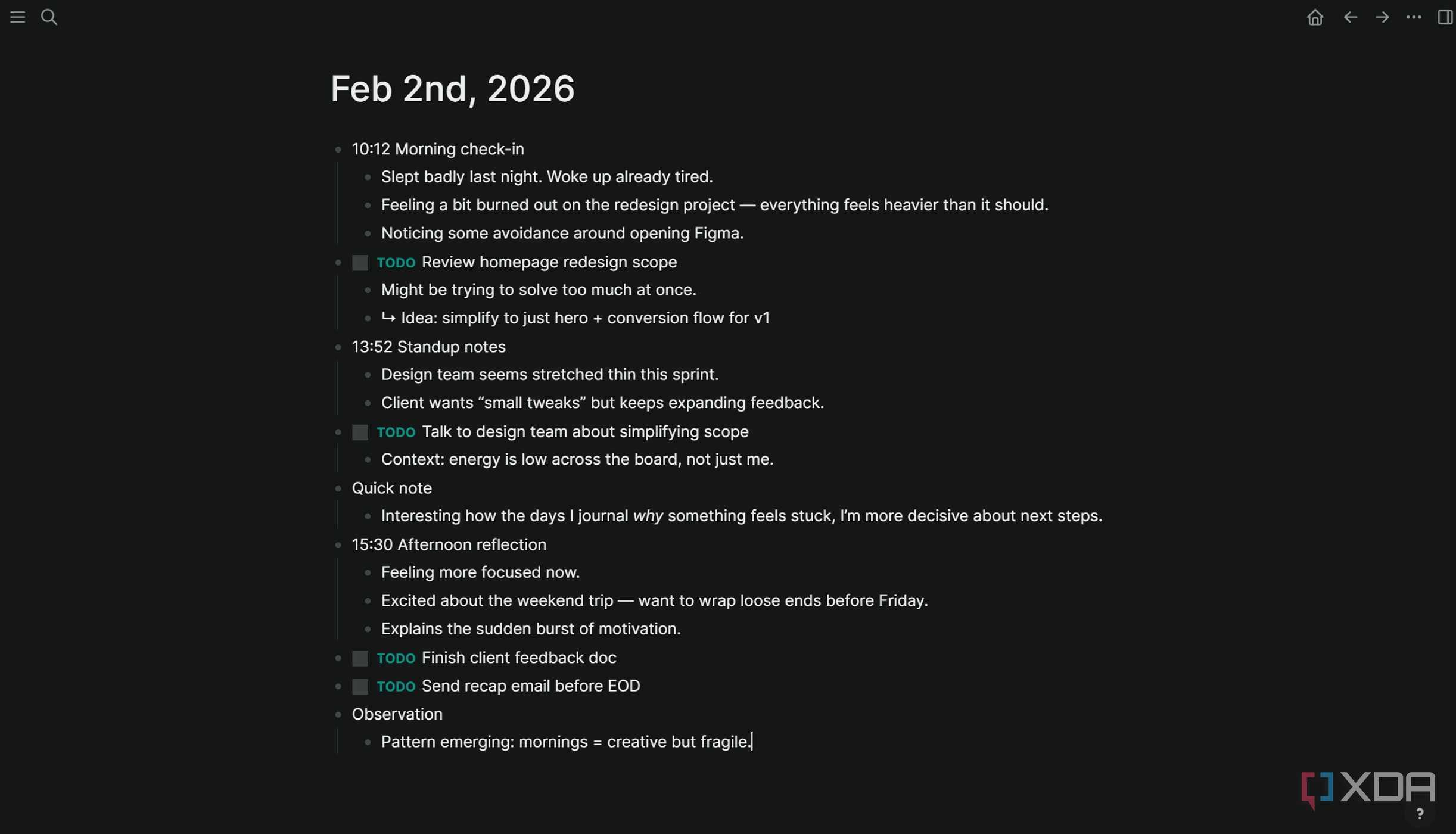 Logseq’s daily pages dissolved this boundary naturally. I journal on the same page where I track tasks and meeting notes. A morning entry might say, “Feeling burned out on the redesign project,” immediately followed by “TODO Talk to design team about simplifying scope.” The journal context informs the task; the task validates the journal entry. Because it’s all timestamped on the same daily page, I can search back and see not just what I was working on three weeks ago, but how I felt about it. That emotional metadata often explains patterns I’d otherwise miss: why certain projects always stall, why I’m consistently more creative in the mornings, and why client meetings drain me more than internal ones.