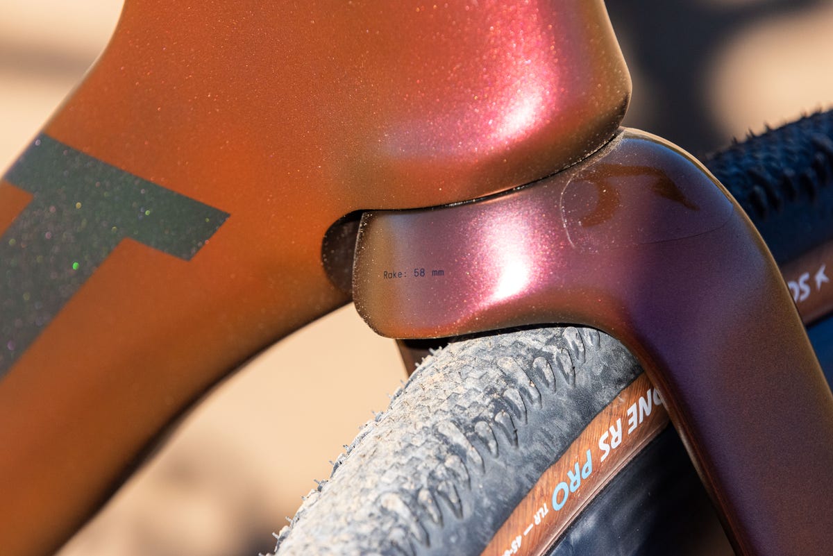 Handling is sharp, especially by gravel standards. With a 71.5-degree head tube angle and a 58mm fork offset, the Racemax 2 Italia’s trail measures 59mm with a 45mm tire — just one millimeter longer than a 54cm Specialized Tarmac SL8. Pair that with relatively short 420mm chainstays, and the result is steering that feels more road-bike than gravel-bike. On firm surfaces and at higher speeds, the bike felt precise and intuitive, with quick responses that never tipped into nervousness. Riders who prefer crisp, direct handling will likely feel right at home.